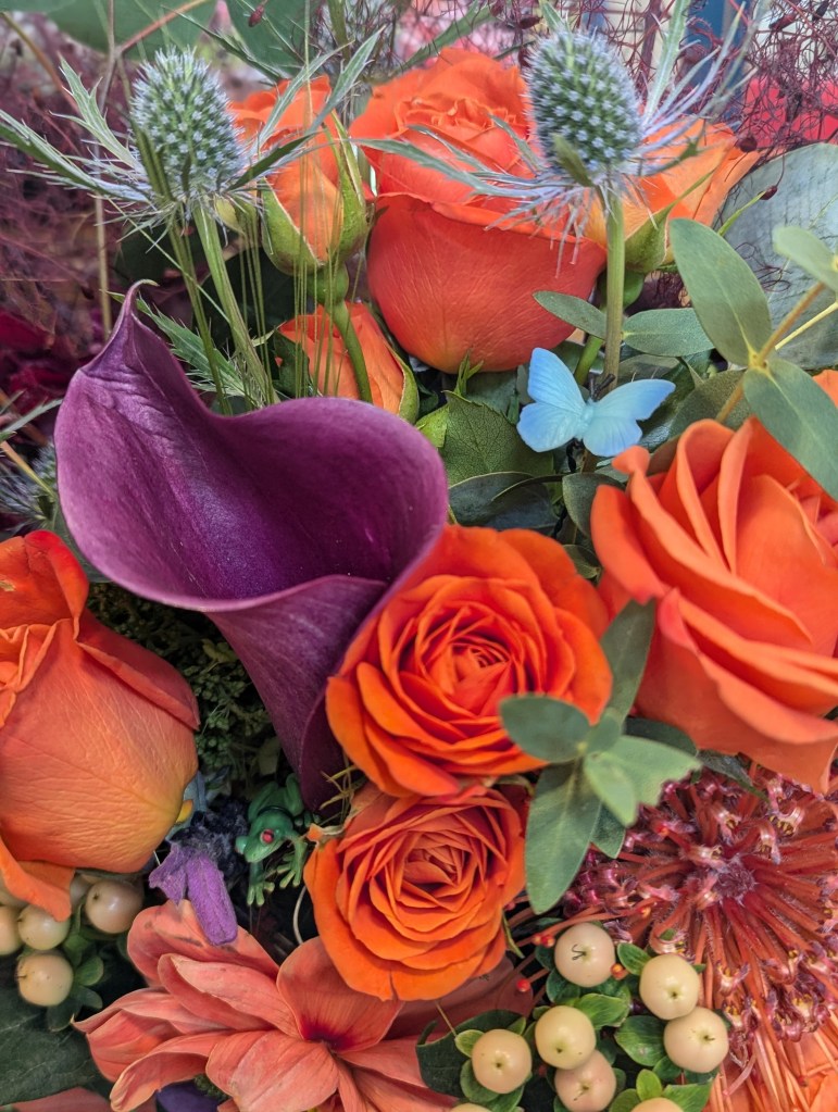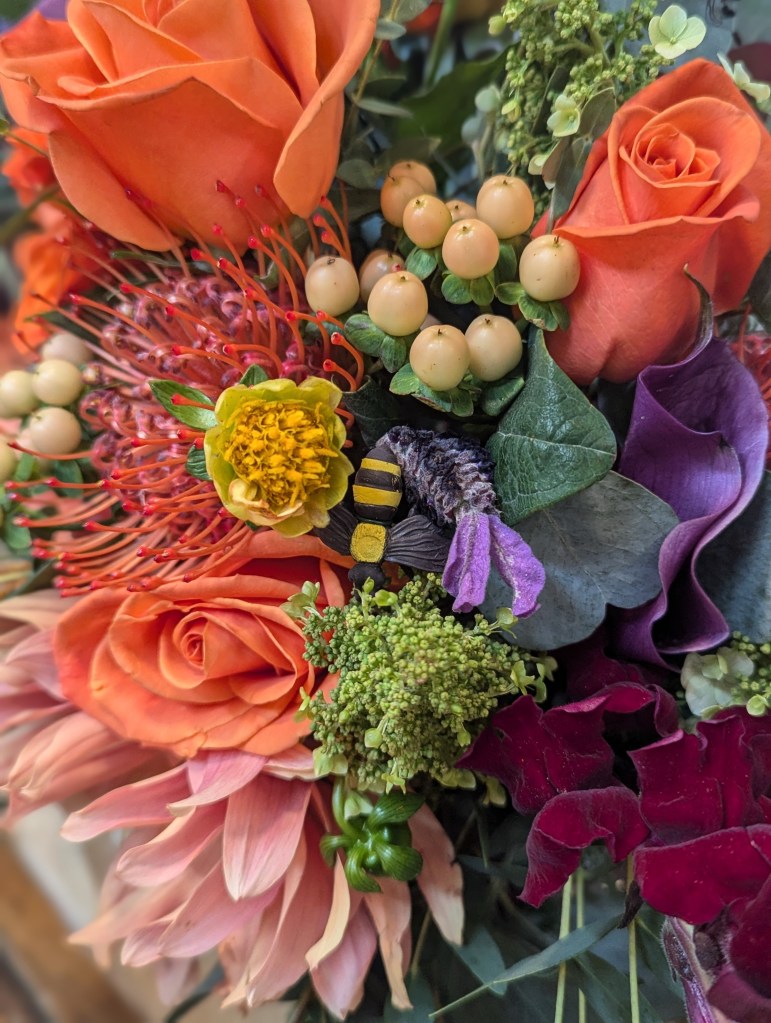 “I am without words, your flowers were perfect! The blue butterfly was sweet, but discovering the frog AND the bee was divine intervention!!”